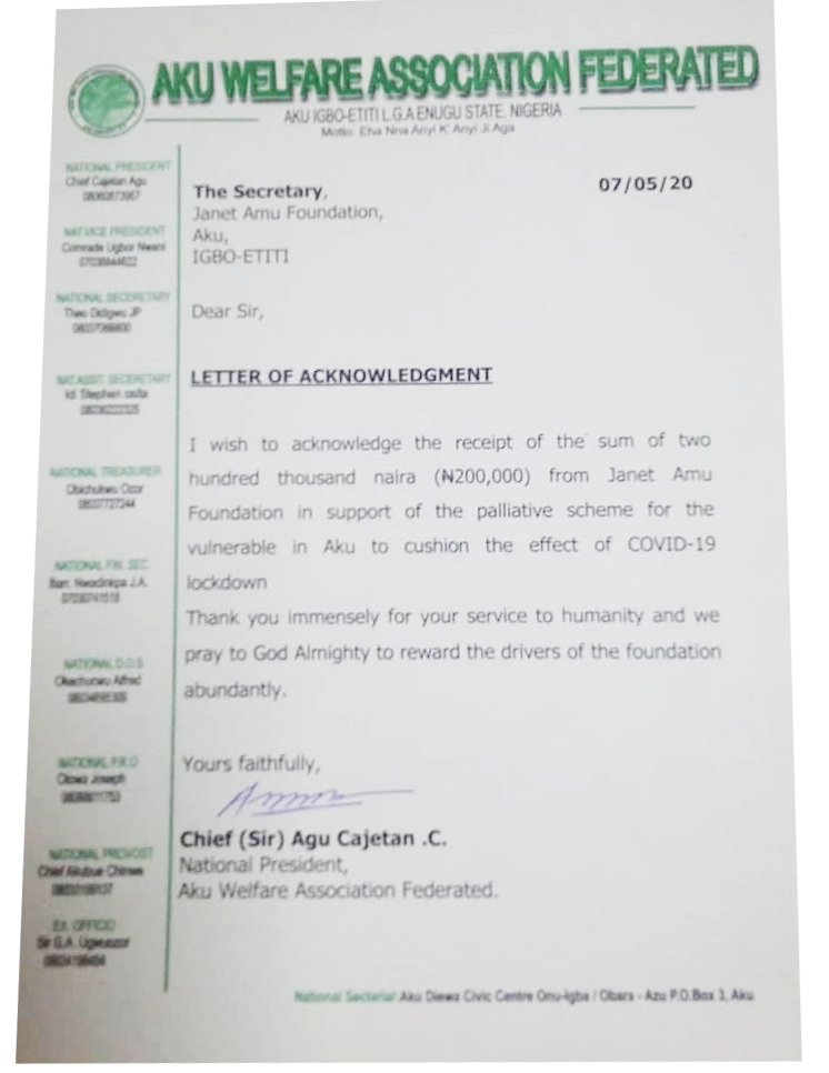 Janet Amu Foundation intervened in my education in 2018/2019 academic session when my education was endangered by lack of funds.