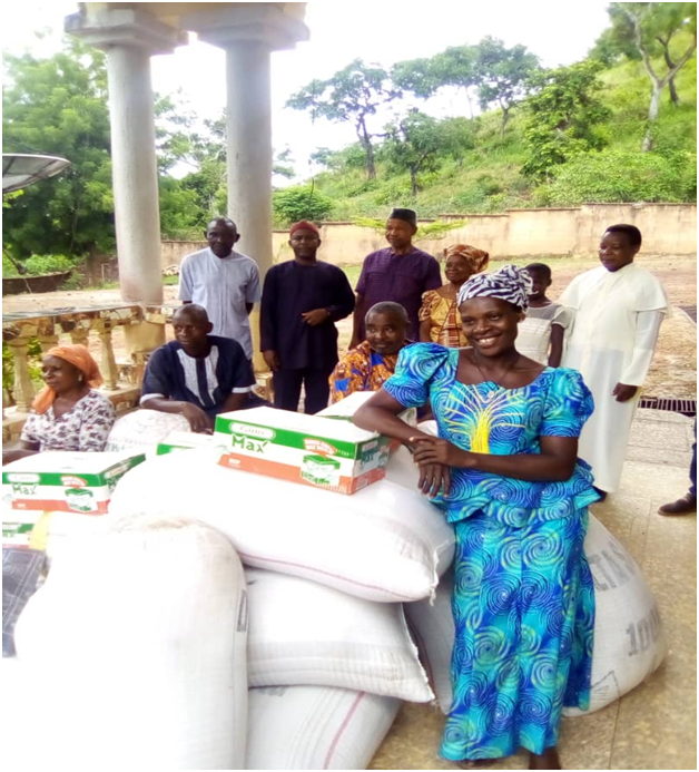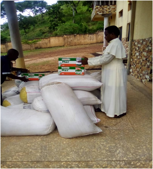 Rev Father John Makata, Dean of Aku Catholic Deanery praying over the palliatives donated by Janet Amu Foundation -JAF to St James’ Catholic Church Parishioners during the COVID-19 pandemic.