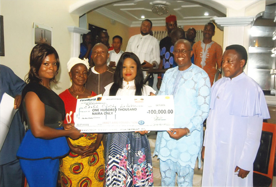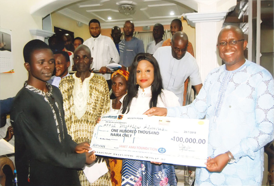 JAF President and wife presenting a cheque to Miss Ezike Oluchi Lilian during the inaugural award ceremony on July 29, 2018