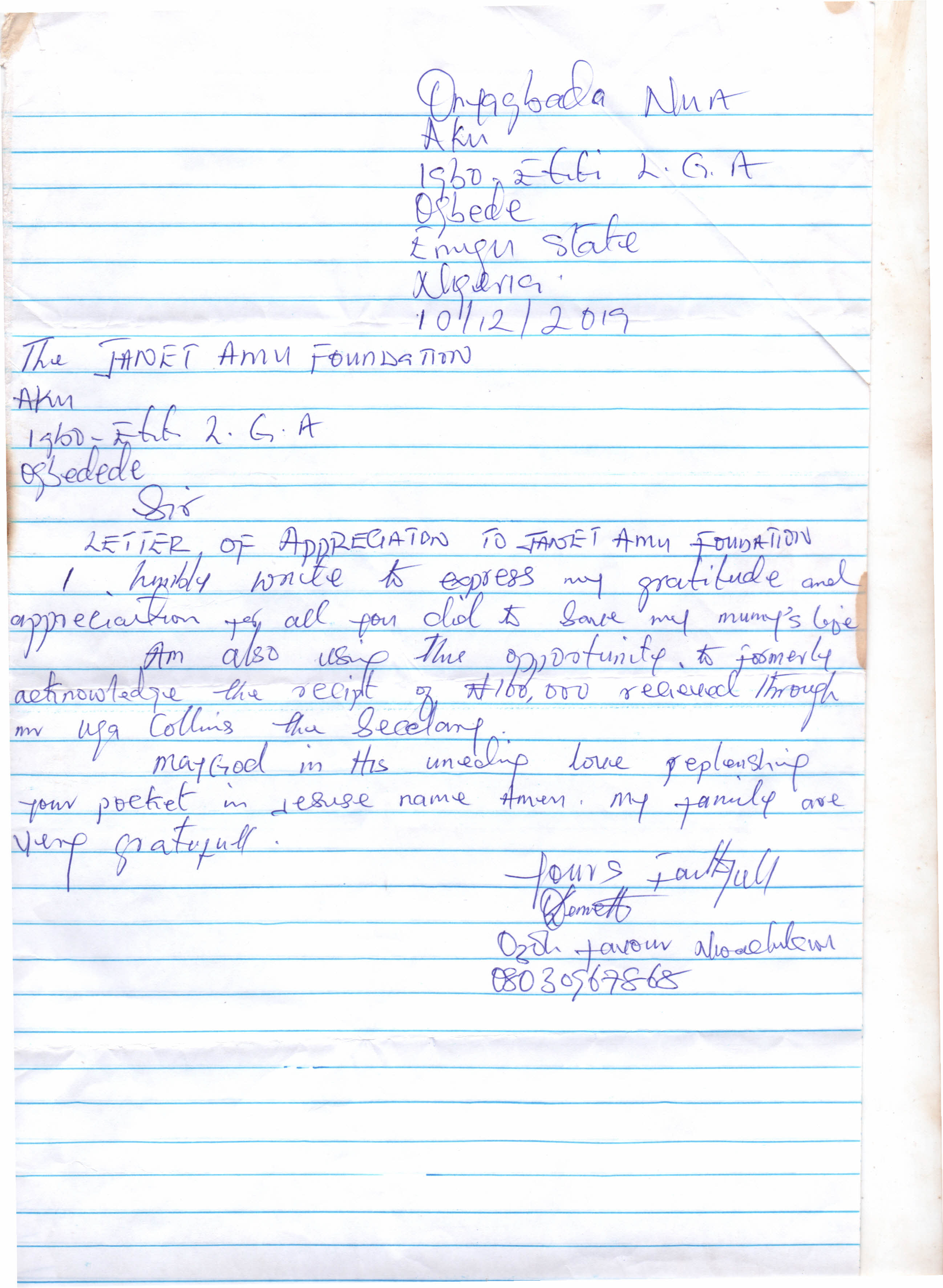 When I heard about Janet Amu Foundation, I went and got their form. God made it successful for me. I am very grateful for what the Foundation has done in my life.